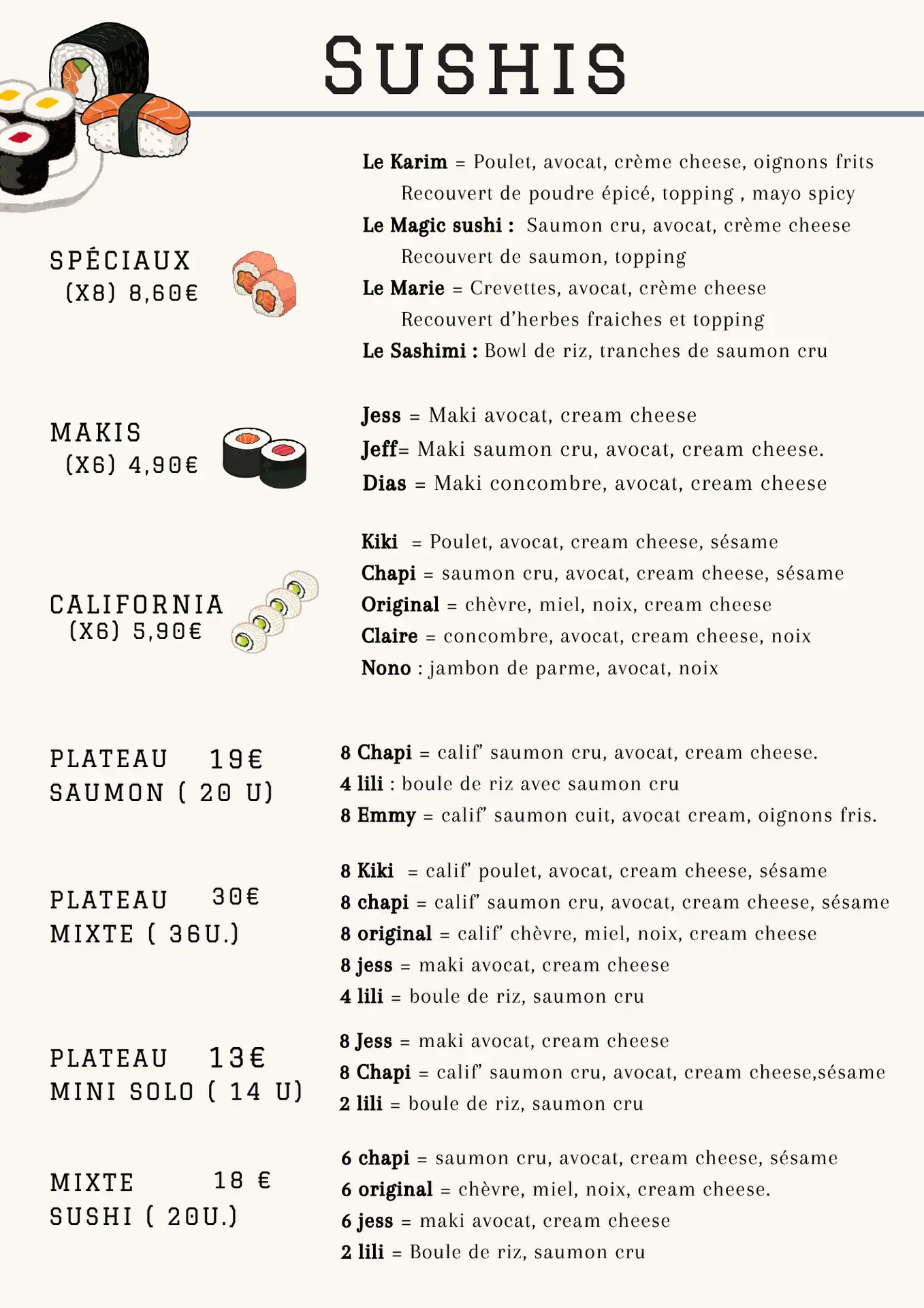- Mixte sushis 18,00 € 20 Sushis mixtes, chèvre, saumon, avocat juste pour goûter et on partage ?